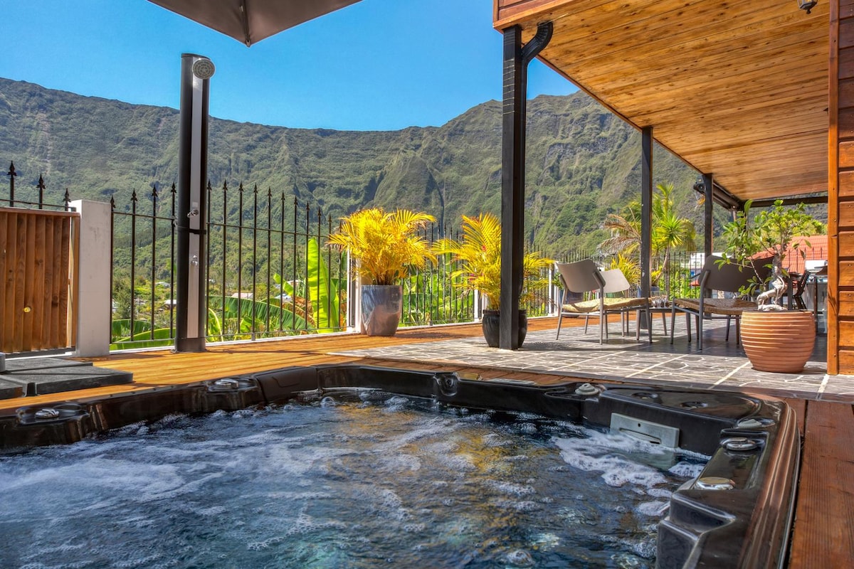 Villa neuf au design raffiné , construite sur mesure pour répondre aux besoins des voyageurs visitant Cilaos: Elle offre une magnifique vue sur le piton des neiges, gros morne et les 3 Salazes ! Idéalement situé : 5 minutes en voiture avant la ville, 1 minute à pied du marché u express ! Chaque chambre dispose de sa douche à l'italienne Cerise sur le gâteau : elle dispose d'un jacuzzi! ( en extra :20€/nuit) Une cuisine équipée, un confort exceptionnel et un accueil chaleureux vous attends !!