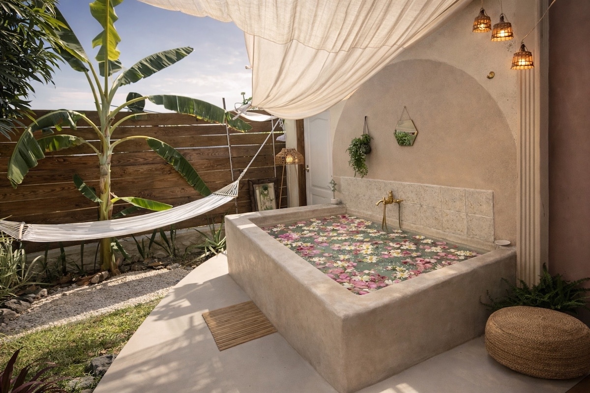 •Ici, un lieu ᗩTYᑭIᑫᑌE, fait main, légèrement enchanté. •Une SUITE lumineuse, poétique, avec Bassin naturel minéral et artisanal, cuisine d’été et jardin Tropical. • le bassin du refuge est À mi-chemin entre le bain et la mini-piscine, Conçu pour deux personnes, Le bassin est pensé comme une expérience naturelle et relaxante et non comme un spa traditionnel chauffé.