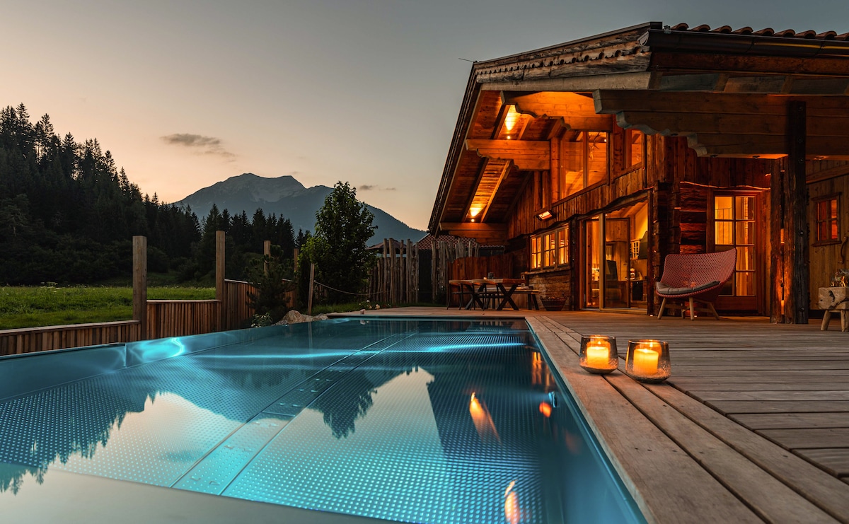 The penthouse's central great room infuses a modernist sensibility into the classic alpine chalet, featuring vaulted ceilings of rich wood, expansive hardwood floors, plush rugs, beautiful modern light fixtures, and sleek metallic fireplaces. After a long day of skiing or trekking in the mountains, enjoy your canapés and champagne in the sumptuous lounge, and step onto the balcony with a cup of hot cocoa to savor the sublime vistas. Then gather around the long wooden dining table for a delicious feast.