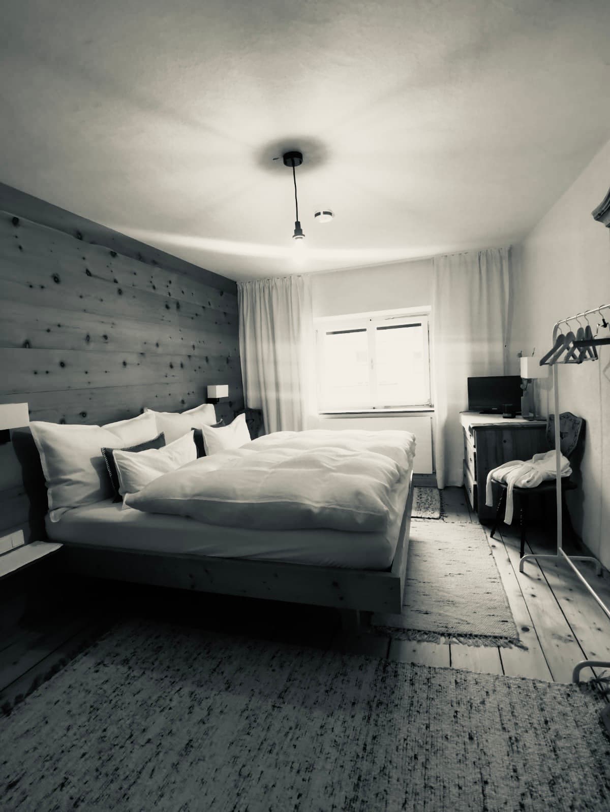 Scrap wood meets Swiss stone pine - these two terms are written in capital letters in our company. The 20 square metre double rooms offer enough space for a relaxing holiday. Your own balcony invites you to take a sunbath and breathe in the mountain air. You can even enjoy a unique, breathtaking view in our showers. Our double rooms can also be booked as single rooms.