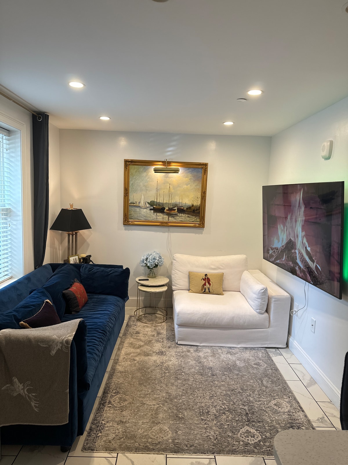 Welcome to our stylish East Boston condo! Just a 5-minute walk to the Blue Line and 11-minute drive (or 25-min walk) to Logan Airport. Only two blocks from the waterfront with stunning Boston skyline views. This modern farmhouse retreat features two cozy bedrooms plus two more beds downstairs. The sleek kitchen and dining area are great for meals or morning coffee. Relax in the comfy living room or enjoy movie nights on the 135-inch home theater. Includes in-unit laundry and off-street parking.