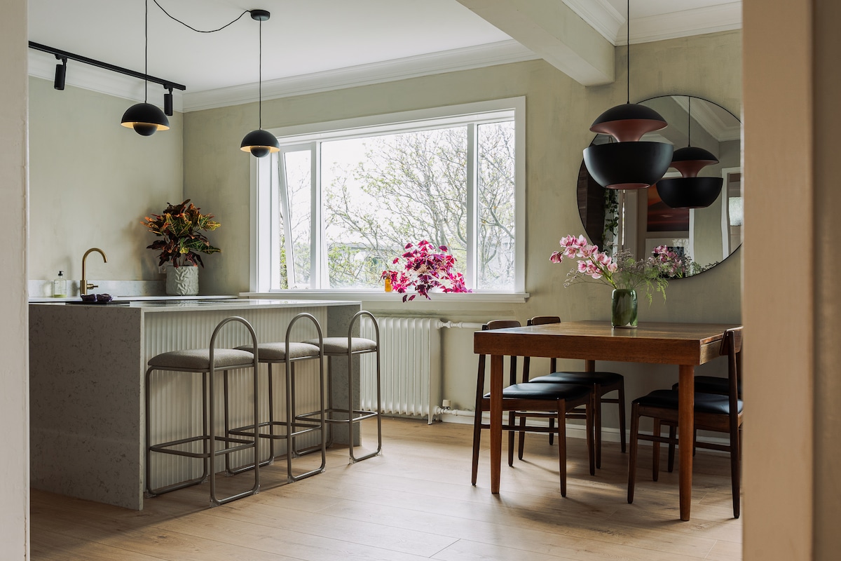 Step into my newly renovated apartment, where vintage charm meets modern comfort. Located on the fourth floor with elevator access, it offers stunning city views, perfect for enjoying the midnight sun from the balcony or the northern lights in the winter! Situated in Laugardalur, near the city center with bus stops across the street and plenty of parking spaces. The apartment is fully equipped with everything you need for a cozy, memorable stay in Reykjavík.