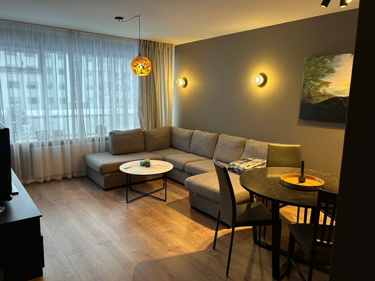 Welcome to the brand-new Luxury Apartment where you have amazing city view from the living room where you can see the top of Hallgrimskirkja.. All the furniture are luxurious and the apartment is decorated with famous Art. Best possible location to explore the local sightseeing, within walking distance of main attractions, top restaurants, shops, entertainment, landmarks. Convenient FREE parking is accessible beneath the apartment building, with an elevator for easy access to your residence.