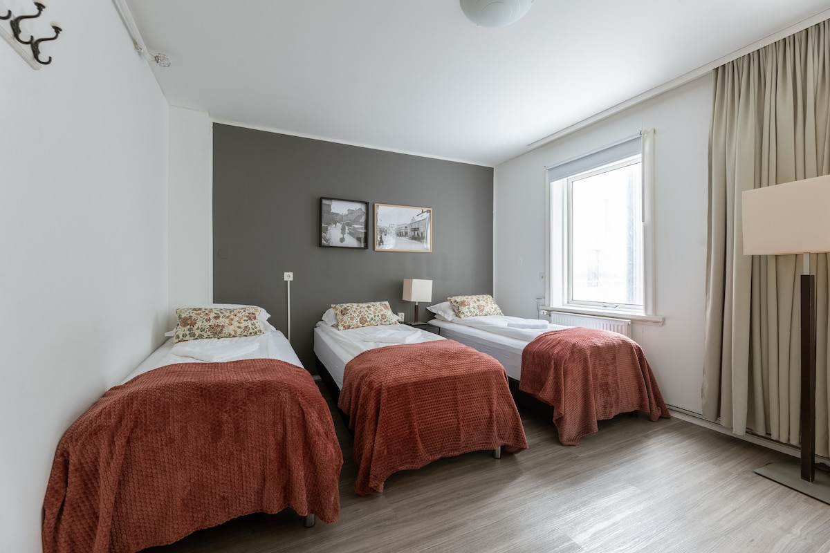 Welcome to your comfortable room at a cosy hotel in the heart of Hafnarfjörður. Our family room is the perfect place for travelers seeking a peaceful stay with all the essentials with simple self check-in and a private locking entrance, you can arrive at any time that suits your schedule, we have enough parking space and settle in with ease. You’ll find a comfortable bed and tv where you can unwind after a long day of exploring.