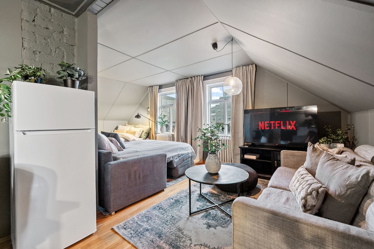 Luxurious rooftop apartment in the heart of Reykjavík, right next to pretty much everything downtown. Only a short walk to all the best cafe's and restaurants, libraries, museums and shops. The apartment is located in a unique early last century wooden house which was once called the palace of Hverfisgata. Recently renovated it retains all the charm of old but with all the comfort and style of modern day life. Please note that there is no elevator in the building.