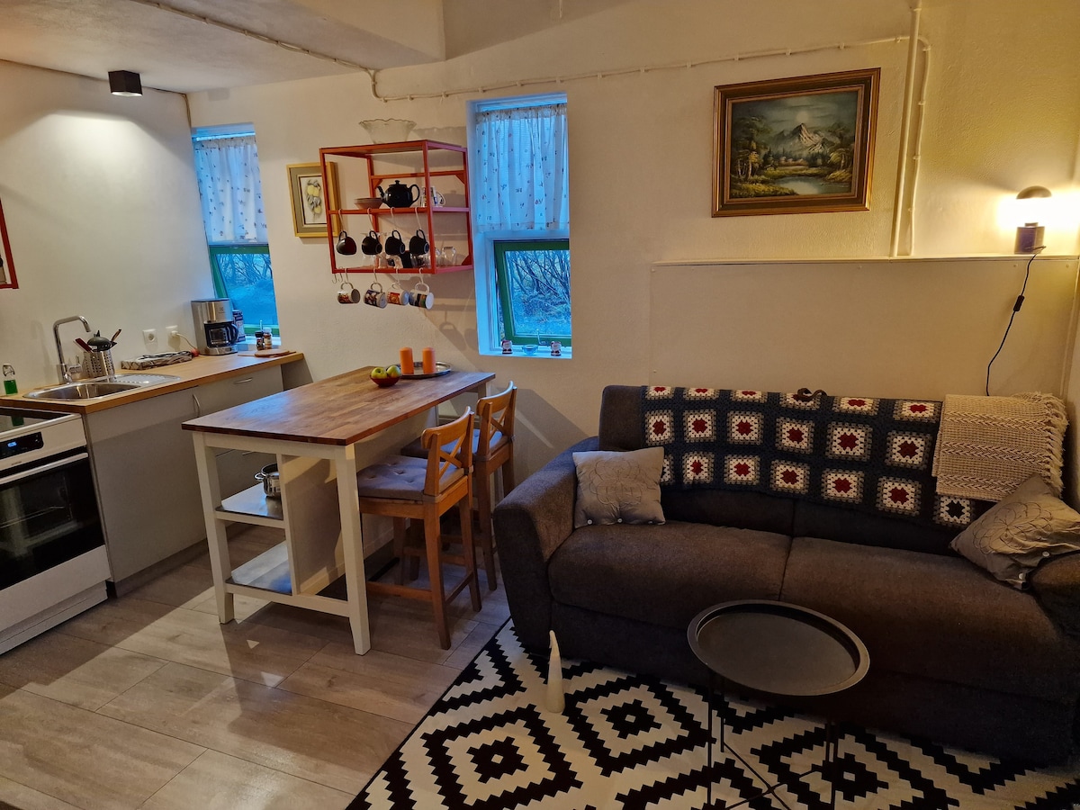 A studio apartment in central quiet area, suitable for 2 persons. (3rd guest possible, but tight) along with bike and gear area, available upon request great for packing and unpacking the Iceland expedition of lifetime. Free parking on site for up to 3 cars. A fully functioning kitchenette and lounge chair. Outdoors dining area with gas BBQ, ideal for sunny afernoons. Important: Warm shower is outdoors! Walking distance 4 min. to local swimming pool and store. Along with the local bar Mossley.