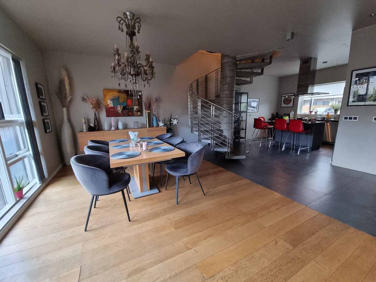 A beautiful house in the best location in Kópavogur, accommodating up to 8 guests. The house has 3 bedrooms and 2 bathrooms. There is a garden with a patio and it’s close to all services and shopping centers. The house features numerous artworks by Icelandic painters, which are regularly changed. Only a short distance to downtown Reykjavík. • Shopping center – 5 minutes by car • Sky Lagoon – 5 minutes • Tennis courts – 5 minutes • Golf course – 10 minutes • Downtown Reykjavík – 10 minutes