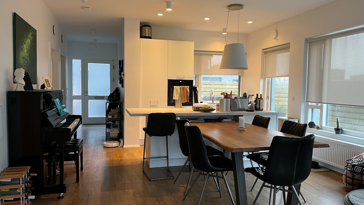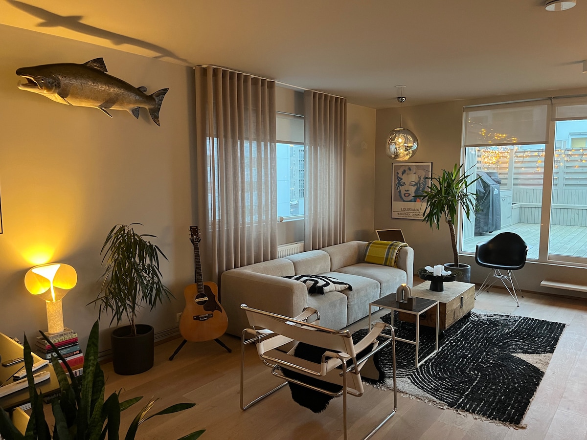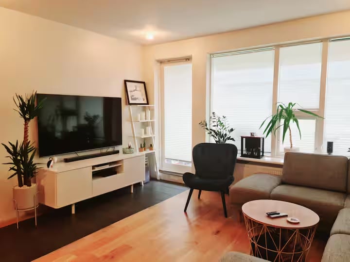 Luxurious and comfortable 100 sqm apartment at the outskirt of Reykjavik close to nature. Two spacious bedrooms with King-size beds. Master bedroom features ensuite bathroom/shower, private balcony and lots of storage. The second bedroom is next to other bathroom including a washer and dryer. Fully equipped kitchen. Large dining and living area including a 65 inch Smart-TV and a balcony. Private parking space in a parking garage. Public transport and a supermarket across the street.