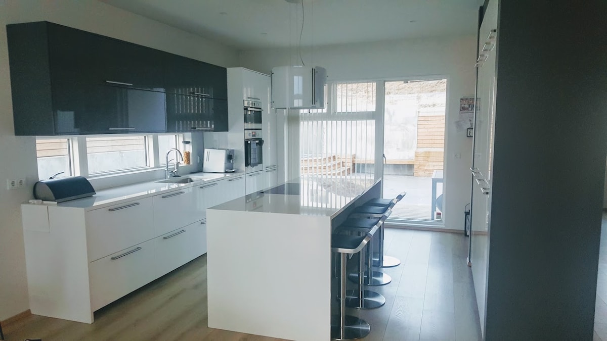 Our spacious home is 265 fm2 with private parking, sea view and nice garden in quite neighbourhood 10-15 minutes from downtown Reykjavík by bus/car. Bus station is 2 min walk away. 5 min walk to local swimming pool, 24 hours supermarket, pharmacy, bakery, ice cream store. Beautiful sea and sunset view restaurant/bar 2 min walk away. The kitchen and living room is in an open area - very spacious. There are 4 bedrooms and the beds arrangement can be changed perfect for family.