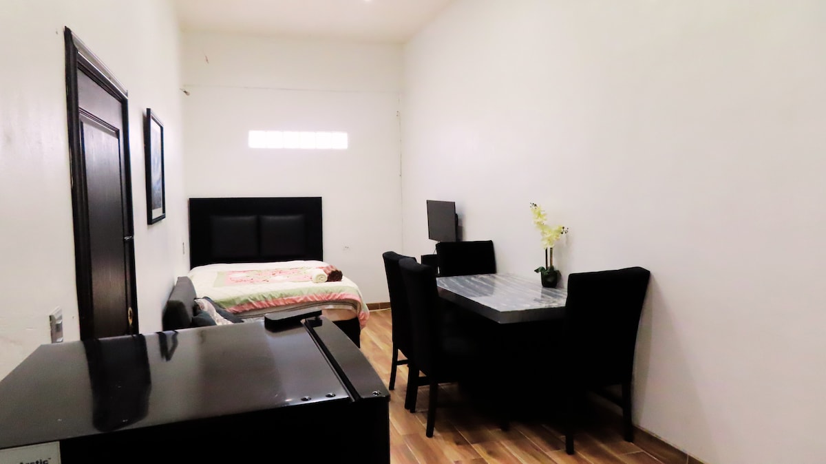 Relájate en esta casa completa ubicada frente al parque de una colonia tranquila. Ideal para dos personas. Cuenta con 1 habitación, 1 cama cómoda, 1.5 baños, sala, cocina equipada y área de trabajo, con aire acondicionado en toda la casa. Estacionamiento privado y techado, con área de asador. ¡Las mascotas son bienvenidas! Tiendas de conveniencia, farmacias y restaurantes se encuentran a menos de 5 minutos. ¡Te esperamos con un espacio limpio, cómodo y en una excelente ubicación!