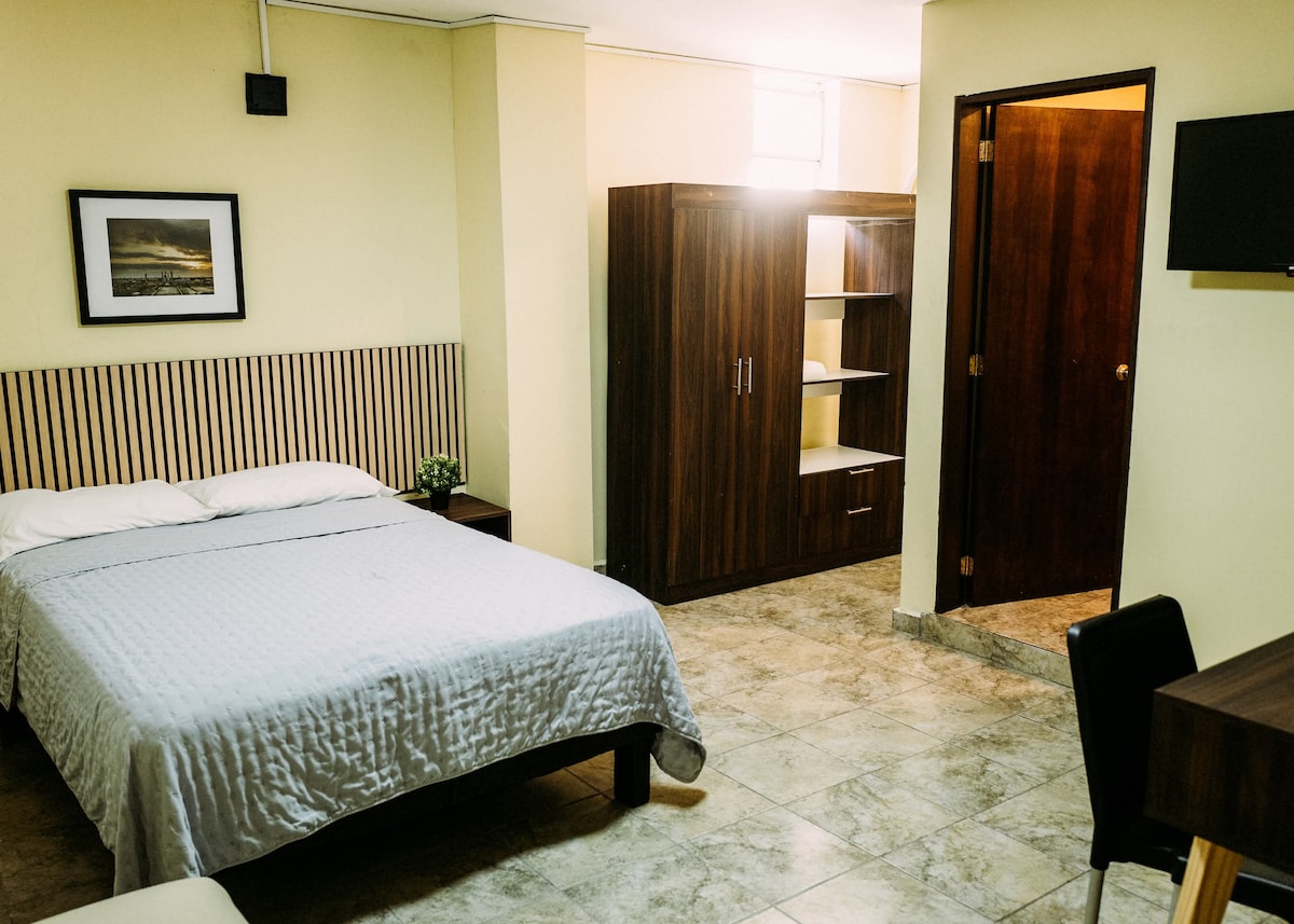 Suite moderna, con tv de pantalla plana, baño privado, closet muy amplio, contamos para tu comodidad, con un area común en la cual puedes cocinar tus alimentos y guardar bebidas en el refrigerador, además tenemos la terraza techada con asador tipo argentino, donde puedes preparar tus cortes favoritos y convivir de un rato agradable con tus familiares o amigos
