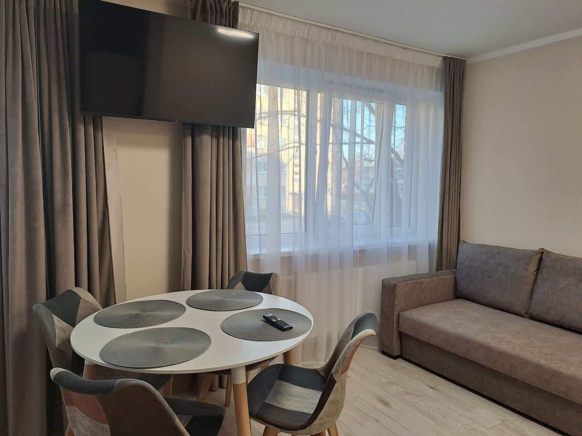 Cozy one room apartment in the very center of Rezekne - only 10 min walk away from the Concert hall GORS. Many cafes, places to eat, shops just around the corner (Ausmeņa Kebabs, IGGI Burger, Hesburger). Although it's located in the centre of Rezekne, the windows are facing the backyard, so it’s rather calm even at the busiest hours of the day. There is 1 bed and 1 sofa bed, so up to 4 people can stay (in 1 room, however). No parties allowed! Enjoy your stay! :)