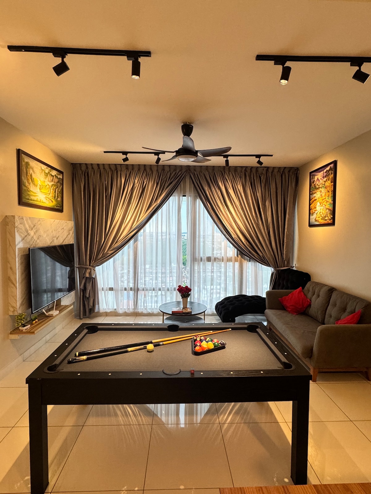Cozy and Beautiful, Mini Pool Table in House, WIFI-enabled condominium with Gym and Infinity Pool in Johor Bahru. The Mall, Southkey Midvalley Mall - 5 Mins WALKING DISTANCE. 65” Smart TV 4K With NETFLIX/ YOUTUBE WIFI 500 Mbs.✅ KSL -10 Min CIQ-10 Min Larkin-20mins Danga bay -18mins Paradigm Mall-20 to 25mins -Light cooking allowed( Salt and oil provided) -Washing Machine -Extra Mattress Queen size available with Pillows and Blankets- Total Rm 50(👈🏼 Just for Laundry cost😊