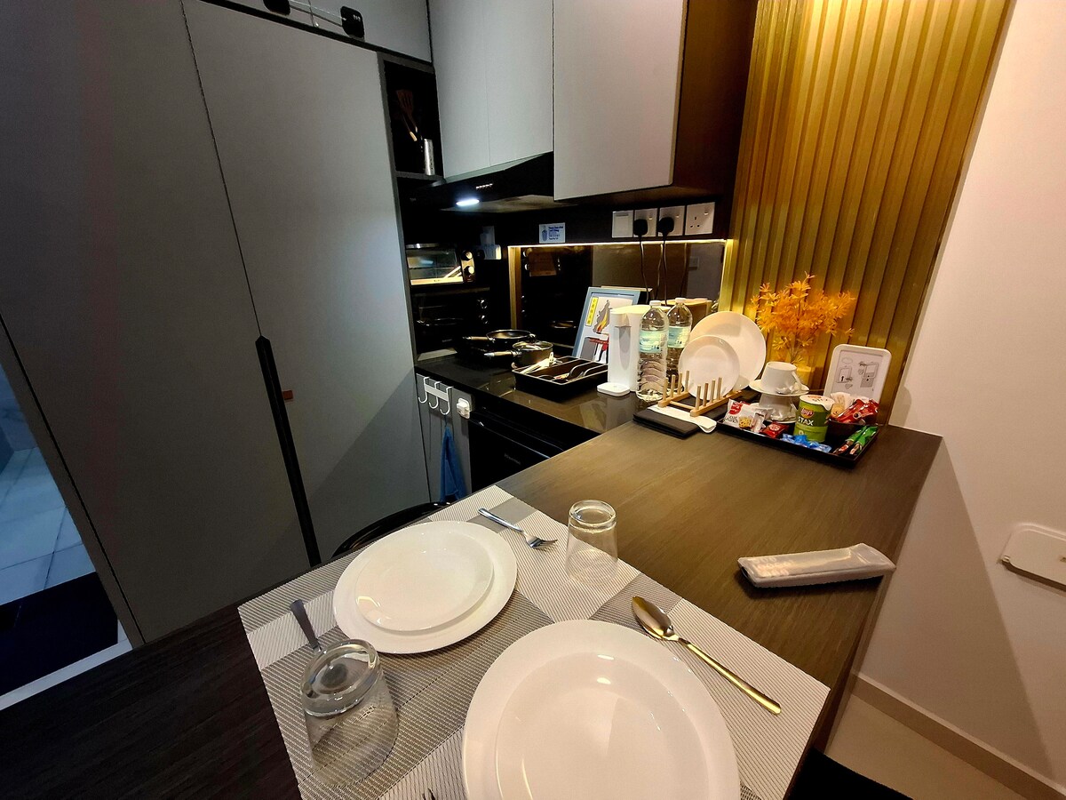 *NEW* DM me the word "New package" to enjoy 8% cashback. Escape to our stylish 2BR condo on the 33rd floor in Johor Bahru. This modern minimalist retreat offers stunning city skyline views and comfortably sleeps 6-7. Perfect for families or business travelers, it features an HD projector with Netflix, high-speed 5G Wi-Fi, and a well-equipped kitchen. Enjoy a unique urban getaway with resort-style amenities.