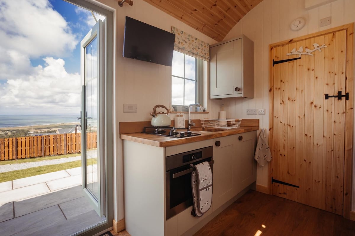 Here is our newly completed shepherds Hut -Gwenlli a welsh name that depicts the view of Bardsey Island on the horizon. Situated in a peaceful corner of our field, nestled in the hills above the small village of Talybont in Snowdonia. Overlooking cardigan bay and boasting panaramic views from the Snowdon mountain range in the north to witnessing a memorable sunset over the Lleyn peninsula with a drink in your hand whilst relaxing in the easy to use electric jacuzzi hot tub.