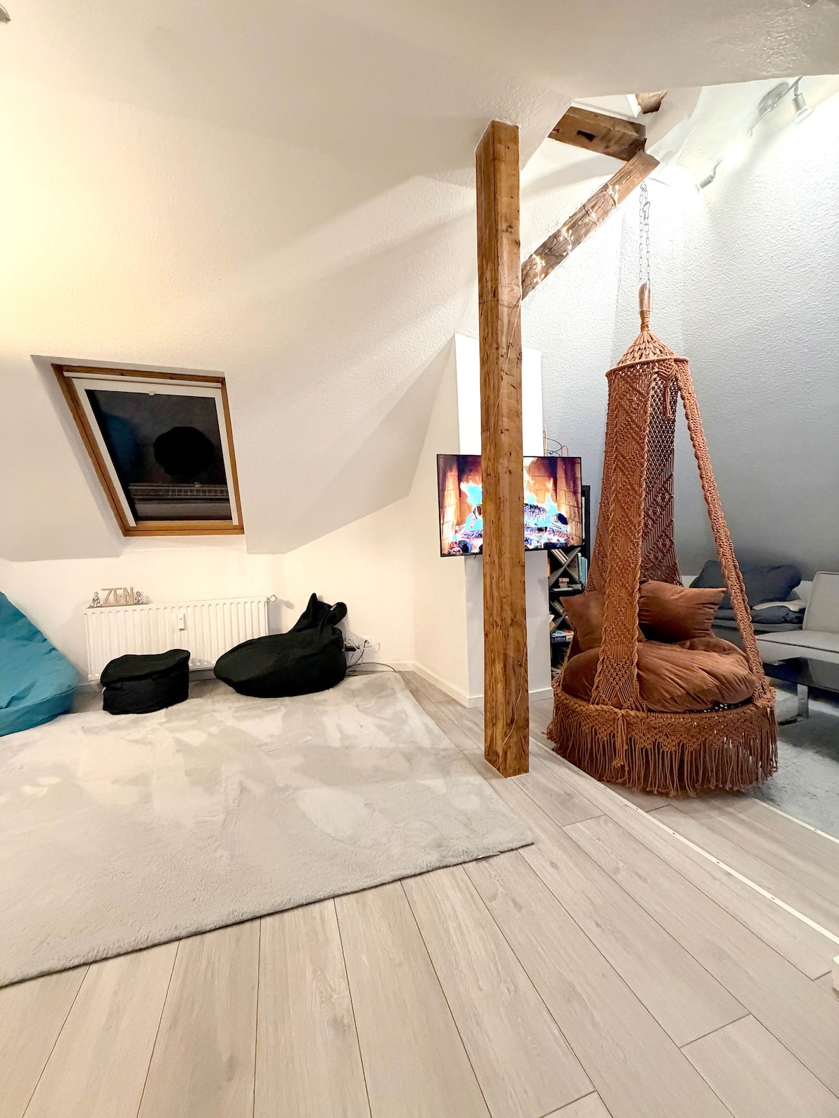 A bright, comfortable 4th-floor attic filled with original art by your host. Entire private floor with cozy sleeping area and small bath with separate shower. Just 5 minutes by foot to Opladen train station and 16 minutes by train to Cologne (Köln Hbf). Cafés and shops nearby by foot. Note: There is no kitchen, which makes the space perfect for short stays. A microwave is available in the room. The stairwell is shared with other apartments, the entire attic floor is private for your stay.