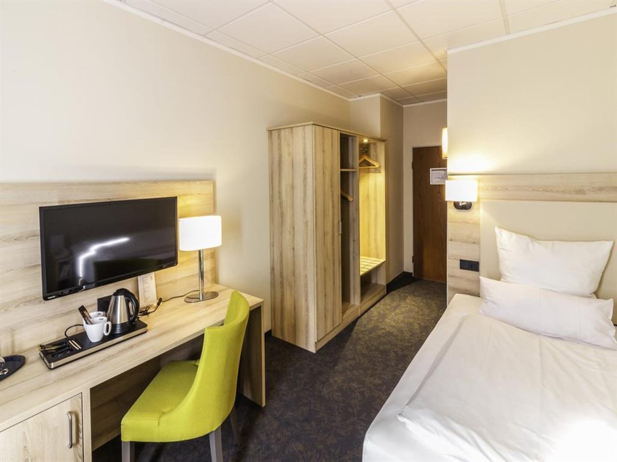 Non-smoking room with balcony (1st/2nd floor) or terrace (ground floor), approx. 15 sqm. Box-spring bed (140 cm), minibar, bathroom with shower, shower stool & hairdryer. Desk, seating area, TV, telephone, Wi-Fi, heating. Suitable for allergy sufferers, choice of pillows, coffee/tea making facilities, socket by the bed. Lift, smoke alarm, key access. View of the city forest, daily cleaning.