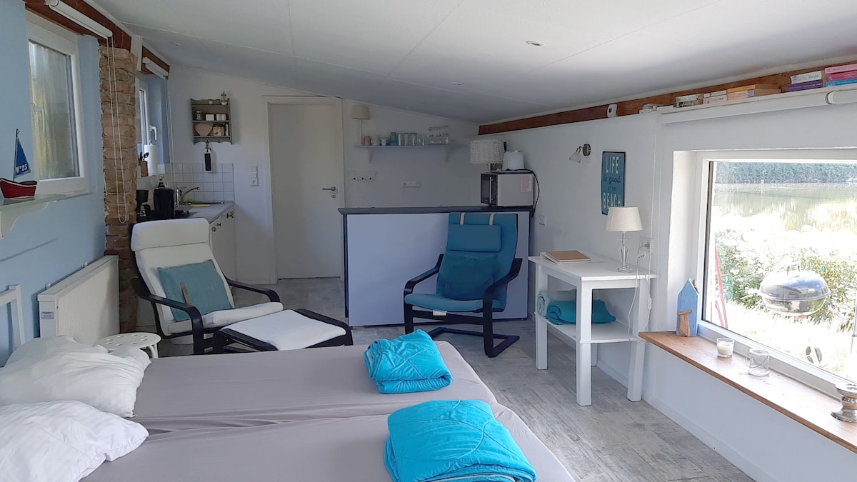 Wer ? kann schon von seinem Schlafzimmer über einen Sandstrand in einen privaten See laufen? Für 2 Personen ein hide-away mit einem großen Luxus. Helles lichtes Wohnzimmer mit Seeblick und Terrasse, sowie überdachter Sonnenterrasse - moderne Küche - ein Duschbad und ein zweites Bad mit Doppelbadewanne, Klimaanlage und sehr großer Fernsehbildschirm, gemütliche Riesencouch zum Faulenzen. Alles kaum 4 km von Speyer weg direkt an einem Naturschutzgebiet. Gänse und Schwäne kommen morens zu Besuch.
