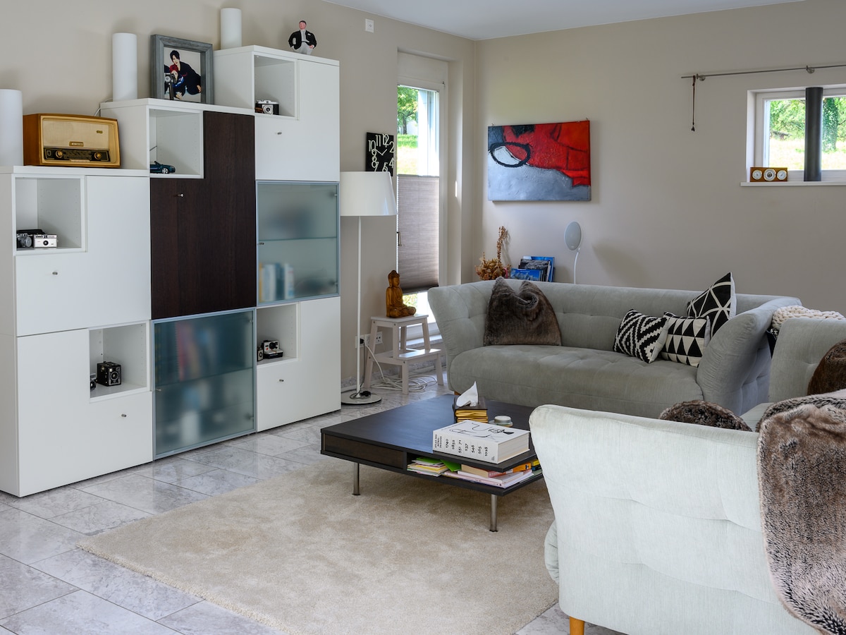 2 rooms in our family home | additional room on demand | shower/toilet | kitchen in the apparment. Out in the green just 15 min from Basel downtown | 50 min to Zurich | 55 min to Bern | 45 min to Luzern