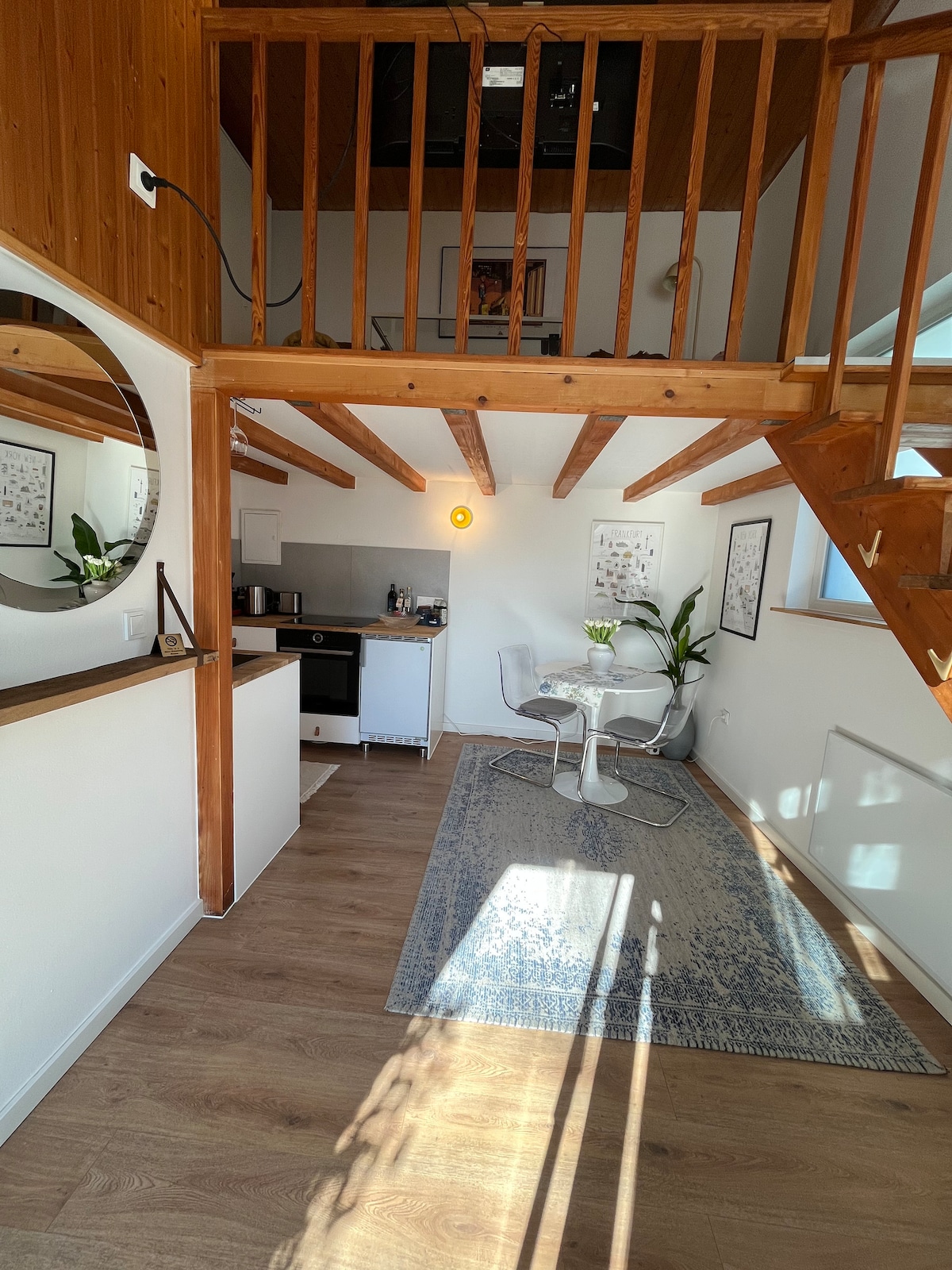 Tradition trifft Moderne Das Kutscherhaus, Bestandteil einer historischen Hofreite, gelegen in dem reizvollen Weindorf Hattenheim am Rhein. Das moderne Holzhaus, mit Naturschiefer verkleidet, steht auf einem historischen Gewölbekeller. Der offene Wohn-Essbereich ist mit einer "Küchenwerkbank", Esstisch und 2-Sitzer Sofa ausgestattet. Bad mit Dusche und WC und eine Außendusche im romantischen Innenhof. Der Schlafbereich im OG ist über ein steile Treppe (siehe Bild) zu erreichen.