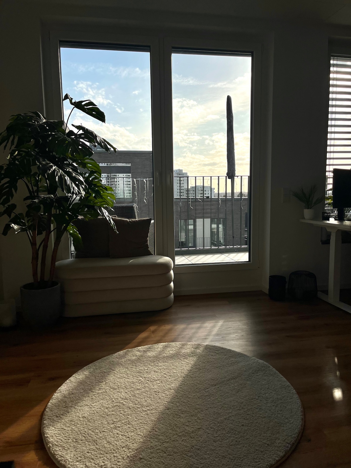 The sun-flooded apartment is located at a urban student quarter and within walking distance to the city center, campus and trade fair. Surrounded by two small green parks, it is equipped with everything you need to live, work, or lounge in comfort. Just enjoy the super fast internet, the home cinema, the view over the city, or the colorful life around. If you like cooking, our kitchen gives you everything you might desire. But be aware, the apartment is on the 5th floor and has no elevator!