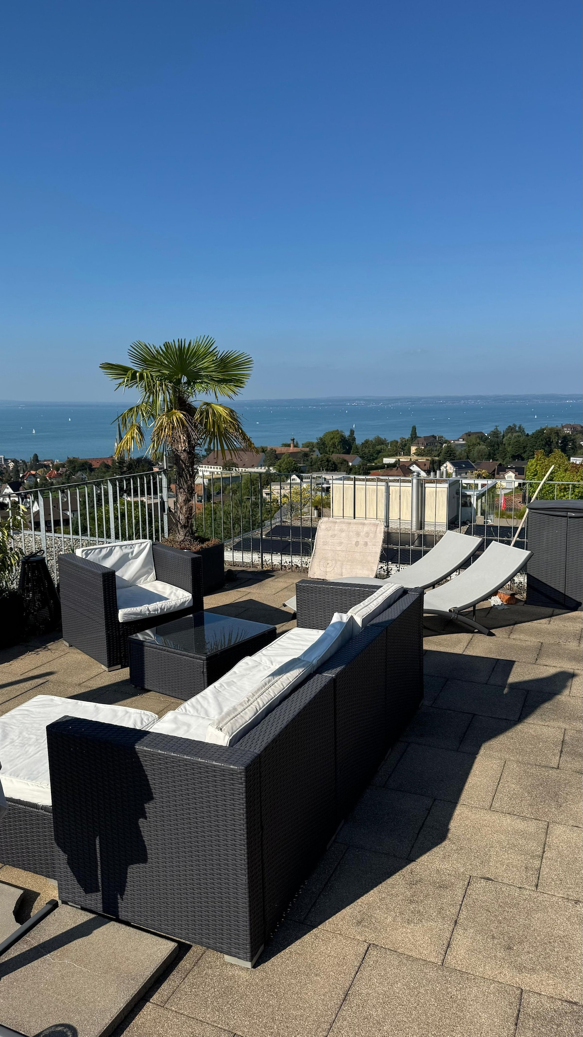 Enjoy sweeping views of Lake Constance and three countries—Switzerland, Austria, and Germany—from the 50 m² terrace of this spacious 3-bedroom, 2-bathroom home. The guest space includes two full floors with open-plan living, a modern kitchen, and room for up to 11 guests. Entry is via a shared hallway, and a long-term tenant lives in the basement. All guest areas are private, peaceful, and ideal for families or groups.