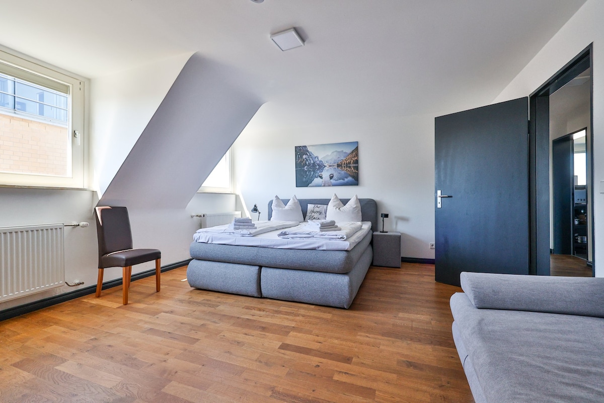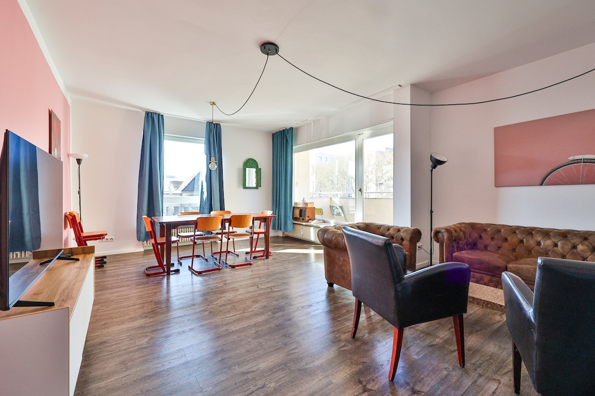 Freshly & stylishly renovated 4-room top-floor apartment (full renovation 11/2025) directly opposite Karlsruhe main station. Bright bathroom with bathtub, separate WC, well-equipped kitchen with dining area & green view. French balconies with city & Palatinate views. Ideal for families, groups, city breaks & business trips. Strict non-smoking home (inside & balcony, extra cleaning fee). Passionate hosts since 2019. Card deposit (250–1,000 €) if required.