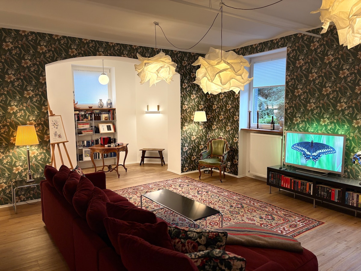 Wunderbare Gartenwohnung (110qm) in Gründerzeitvilla - ideal und ruhig gelegen. Die Wohnung heißt explizit Hundebesitzer und die 4 Pfoten willkommen. Ideal für zwei Personen / ggf. plus 1 Erwachsener oder 2 Kinder (Bettcouch) Garten mit diversen Sitzgelegenheiten und Grill darf gerne benutzt werden. Eine Oase mitten in der Stadt. Fussläufig zum Hauptbahnhof, 5 Minuten zur A66 , 20 Minuten zum Flughafen, 25 Minuten nach Frankfurt, aber wer will schon weg- denn das Rheingau ist vor der Haustür