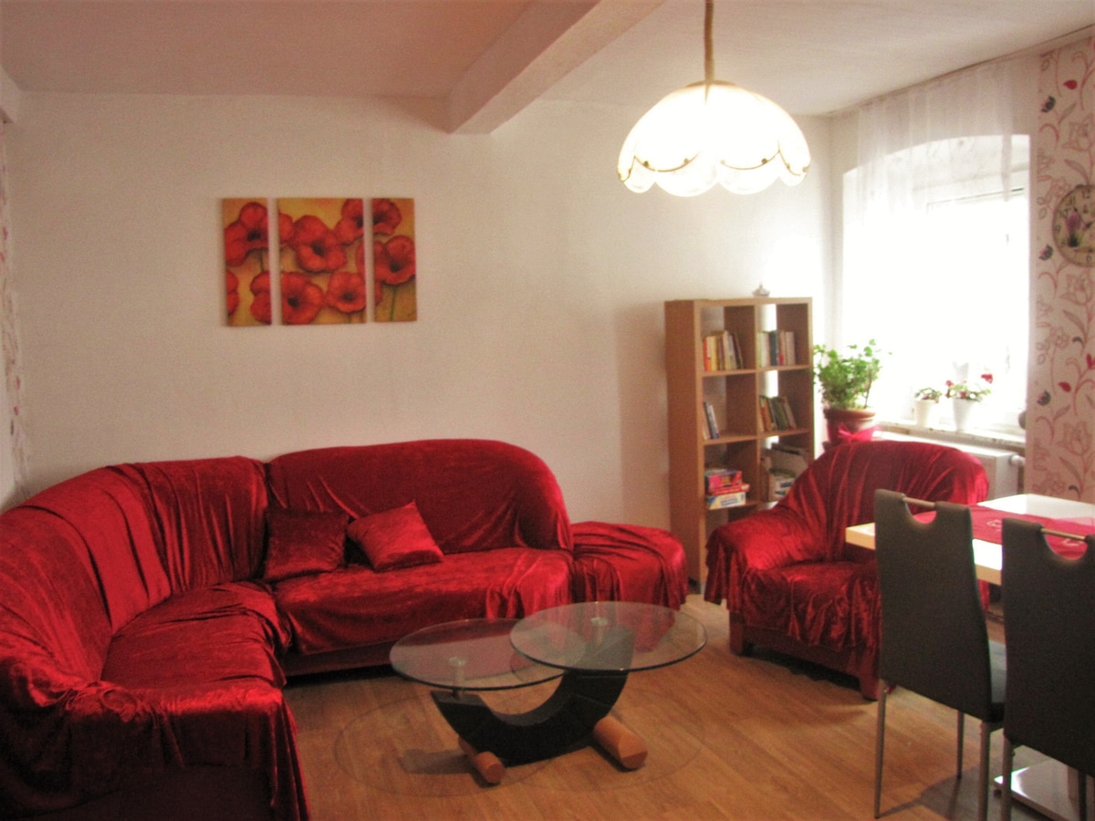 Wir bieten Ihnen eine moderne Ferienwohnung in einem Fachwerkhaus mit besonderem Flair. In unserer Ferienwohnung bieten wir für 2 Personen auf gemütlichen 57qm Platz zum Entspannen. Die Küche bietet einiges an Komfort, wie z. B. Spülmaschine, Mikrowelle, Kaffeemaschine, etc. Der offene Küchen-/Wohnbereich lädt zum Kochen oder einfach nur zum Relaxen auf der gemütlichen Schlafcouch mit Box-Spring-Sitzen ein. Auch im Schlafzimmer mit hochwertigem Boxspringbett lässt es sich gut träumen.