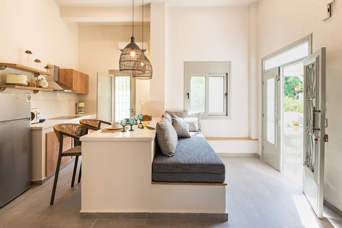 Απολαύστε την απόλυτη χαλάρωση σε αυτό το κομψό και πλήρως εξοπλισμένο στούντιο με μαγευτική πανοραμική θέα στη θάλασσα. Το διαμέρισμα διαθέτει ένα άνετο διπλό κρεβάτι και καναπέ-κρεβάτι, ιδανικό για να φιλοξενήσει έως 3 άτομα. Η ιδιωτική αυλή με σαλόνι εξωτερικού χώρου σας προσκαλεί να απολαύσετε τον καφέ ή το κρασί σας με θέα το απέραντο γαλάζιο. Ιδανικό για ζευγάρια, φίλους ή οικογένειες που αναζητούν πολυτελή διαμονή με άνεση και στυλ, μακριά από τον θόρυβο της πόλης.