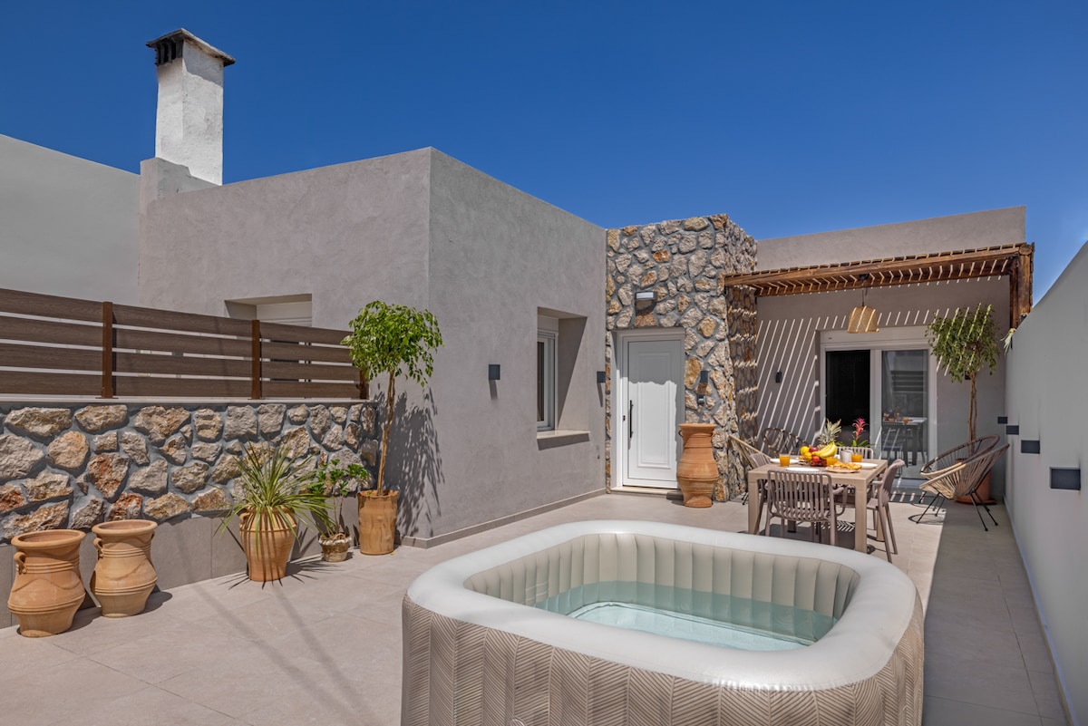 An accommodation that combines the Greek island character with the comforts of modern life. A peaceful retreat with an idyllic view of the Aegean Sea, offering the relaxation everyone seeks on vacation. Enjoy a private heated spa for ultimate tranquility, a cozy patio living room overlooking the sea, a fully equipped kitchen, a bathroom, and a bedroom with a double bed. Surrounded by a large Mediterranean garden with parking, it’s just 3 minutes by car or 10 minutes on foot from Stegna beach.
