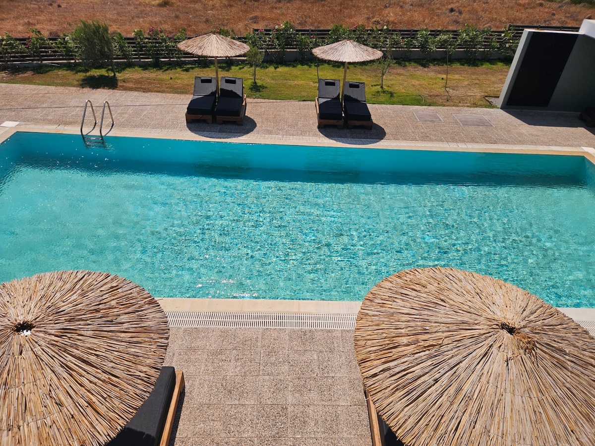 Junior Suite Our fully equipped 40 sq.m. suite (with a capacity of up to 3 people), which overlooks the renovated main pool is a vivid reminder that you have finally found that personal paradise you are looking for in your travels. The Junior Suite with a pool view is one of the top value accommodation options in Rhodes for couples or families who value authenticity and seek privacy and affordable luxury.