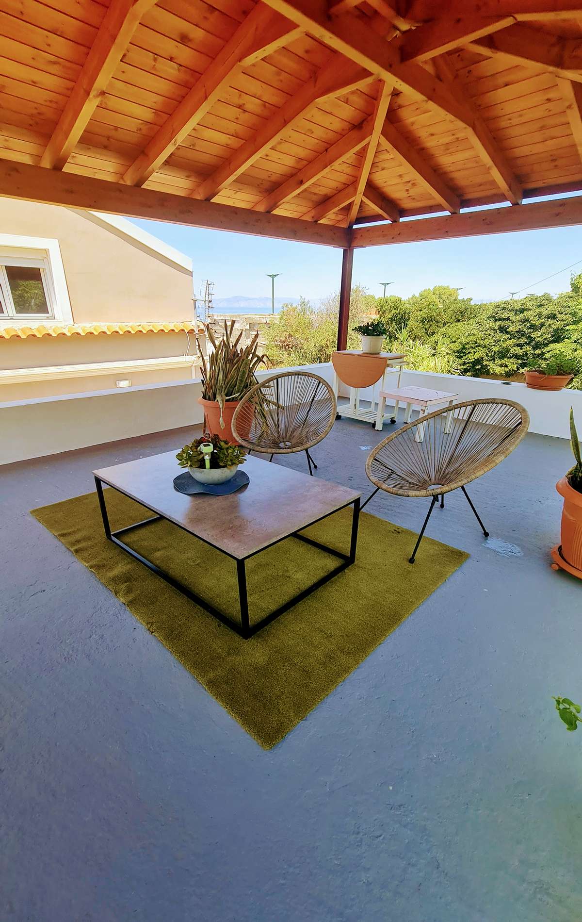 Enjoy a cozy, fully furnished apartment with a warm atmosphere, ideal for two guests. Located right opposite Kritika Beach and just 5 minutes from Rhodes city center. Free parking is available in front of the entrance. A staircase leads to a rooftop balcony with a canopy, seating, and a table—perfect for enjoying stunning sunsets over the sea.