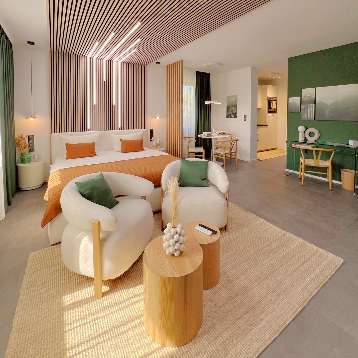 Enjoy undisturbed relaxation in the “Rauschenberg” nature suite: Your unique sauna house in the garden with separate relaxation room and panoramic terrace offers breathtaking views of Fulda and the Rhön. The comfortable box-spring bed guarantees restful nights, while the fully equipped kitchenette with ceramic hob, fridge incl. freezer compartment, pots, crockery and glasses makes cooking a pleasure. A rain shower and high-quality cosmetic products await you in the luxurious bathroom.