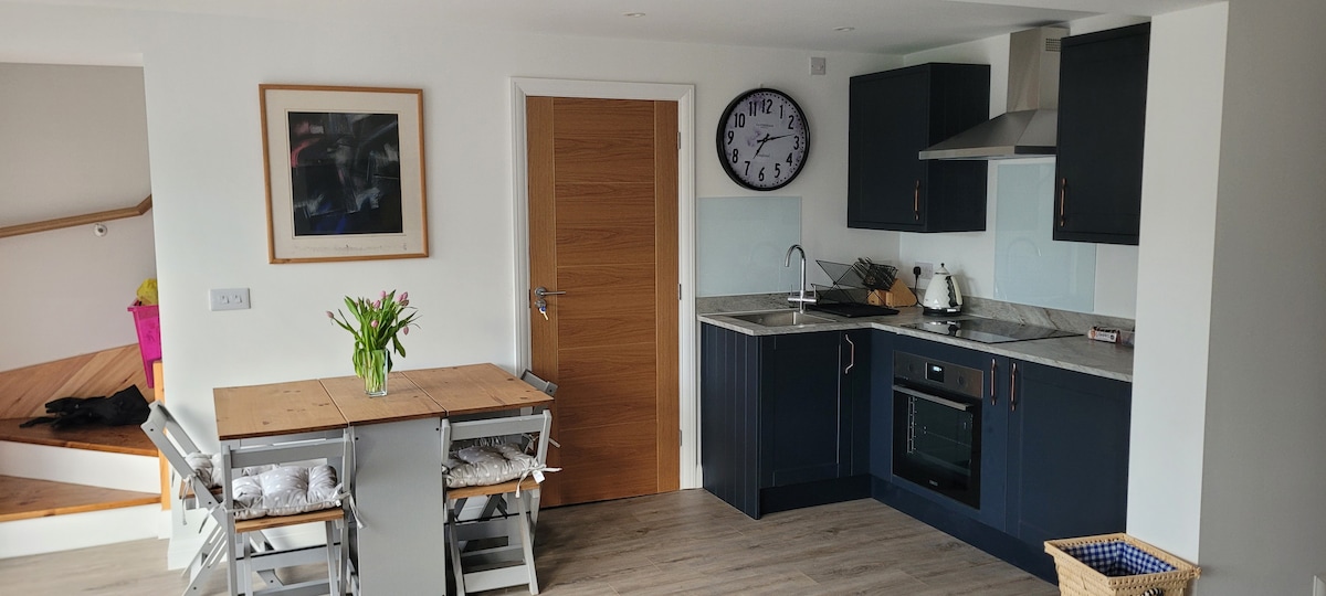 Relax and unwind in this charming, self contained studio apartment. This converted garage is ideally located within walking distance to the town of Pencoed with plenty of shops, pubs and restaurants. Only a 20 minute train ride to Cardiff Central, with free on site parking, ideal for short or longer stay business trips without the hassle of staying in the city. The kitchenette has a microwave, kettle and toaster but no oven or hob. There is a full size fridge and a high bar table to seat two.