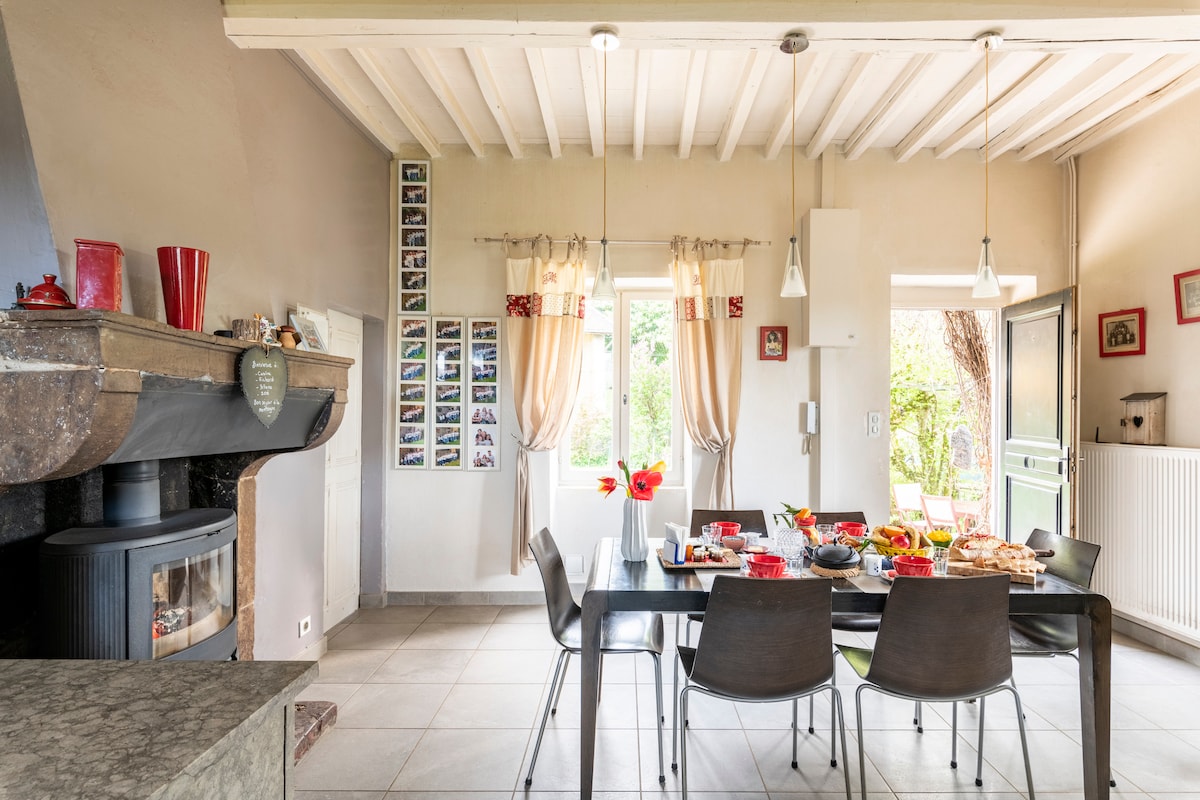 Nous vous accueillerons au cœur d’un village des Pierres dorées du Beaujolais, dans un cadre exceptionnel, en pleine campagne, propice aux balades, à la détente, au repos... Dans une grande batisse en pierres dorées entièrement rénovée, vous profiterez d'une chambre spacieuse au rez-de-chaussée avec une salle de bain et wc attenants. Notre désir est de vous faire passer un très agréable séjour au calme dans notre chambre d'hôtes décorée avec goût.