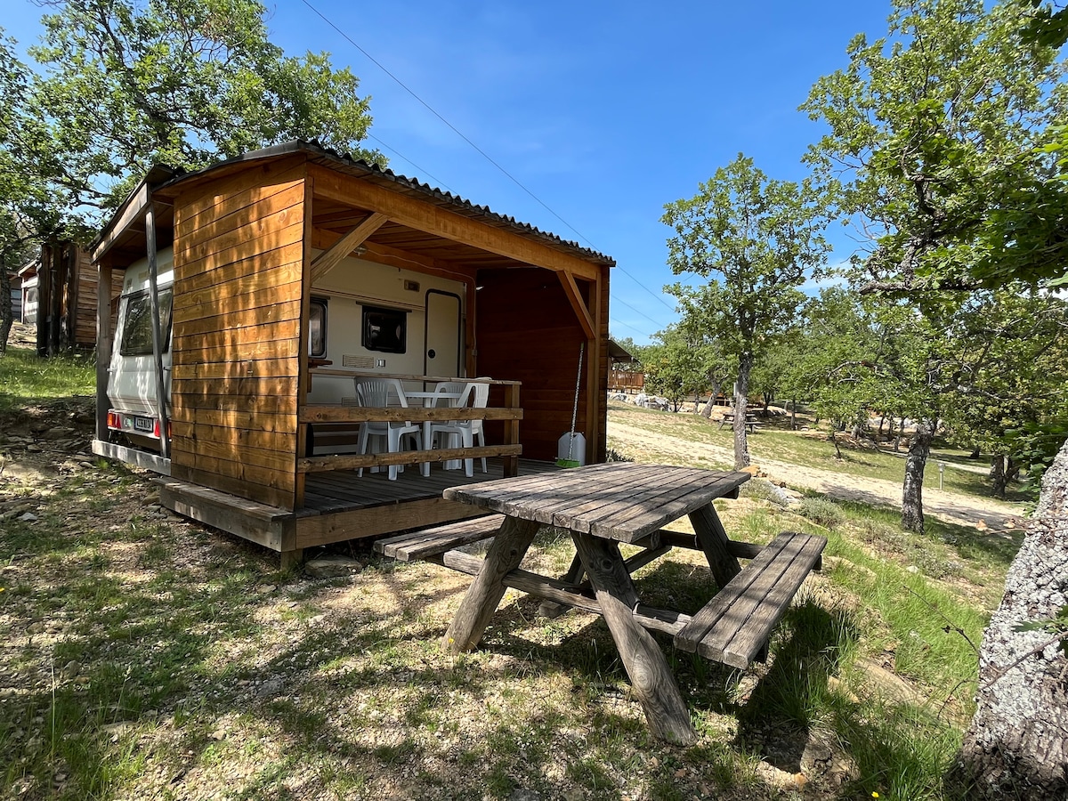 roulotte pouvant accueillir 1 couple dans un vrai lit alcove et eventuellement un enfant sur un lit futon. Tout le confort moderne : micro onde, four, frigo, machine à laver, salle de bain, toilette, internet. Vue imprenable sur les montagnes du Morgon et de Dormillouse. Possibilité de pratiquer à proximité parapente, sports d'eau sur le lac de serre ponçon, sports de rivière eau vive, VTT de descente à la station de st jean montclar, randonnée, VTT vélo de route. Calme et tranquilité !!
