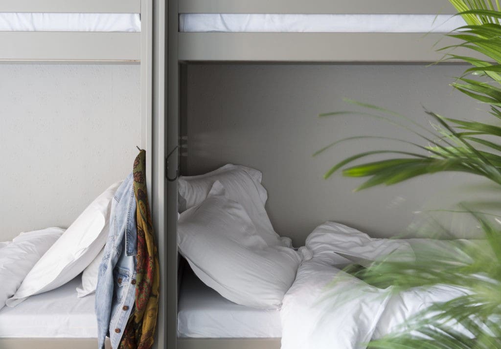 Ici, chambre partagée rime avec intimité ! A réserver par unité sociale, notre dortoir de 4 personnes est équipé de 2 lits superposés douillets et d'une salle de bain privée. Nos lits superposés, conçus et construits par l'équipe de Quartier Libre ont été pensés pour s'adapter aux besoins des adultes : une grande couchette avec rideaux occultants, prise et lumière individuelle.