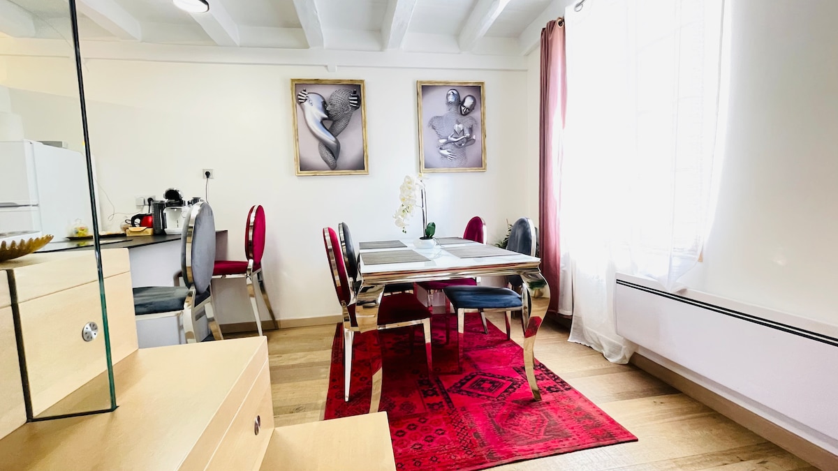 The duplex apartment nicknamed "La Cabane du Thiou" is located in the heart of the old town of Annecy in a pedestrian street, below the castle, on the banks of the Thiou river in "La Maison Charmoisy", a building classified as a remarkable building. You will discover an apartment on two floors, freshly renovated standing (end of works May 2021), with atypical charm and very bright. The condominium has a private courtyard filled with charm with direct access to the river.