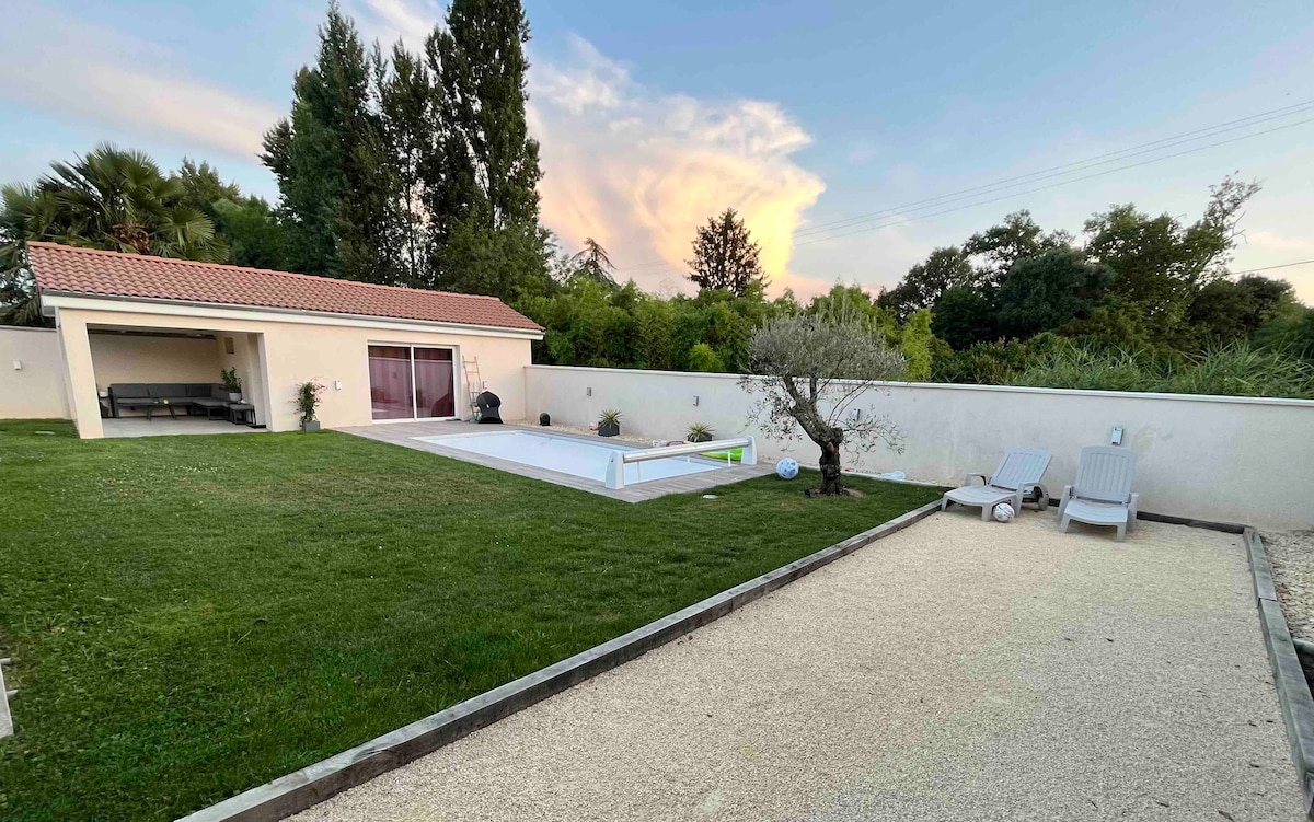 Bonjour, Nous mettons à disposition une dépendance moderne construite en 2020, très bien équipée qui dispose d’une salle de bain équipée privative, d’une terrasse couverte et d’une piscine chauffée à disposition. Cette dépendance est également équipée d’un vidéo projecteur pour des moments cinéma (Netflix/Canal+) Le logement est situé dans un quartier résidentiel très calme a seulement 15 minutes de lyon, et seulement 2 minutes d’une entrée/sortie d’autoroute, donc accès très simple.