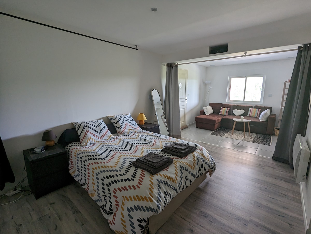 Passez un agréable séjour au calme dans un studio neuf à la campagne, spacieux, avec entrée indépendante, situé à proximité de la sortie A89 (5mn), de la sortie A6 (15mn) et du train TER (à 3km). - Kitchenette toute équipée : frigo, lave-vaisselle, micro-ondes, plaques induction, cafetière, bouilloire, vaisselle - Un lit double et un canapé convertible - Salle de bain avec douche italienne et WC privatifs - 2 télévisions et un vidéo projecteur (nombreux films) - Salon de jardin privatif