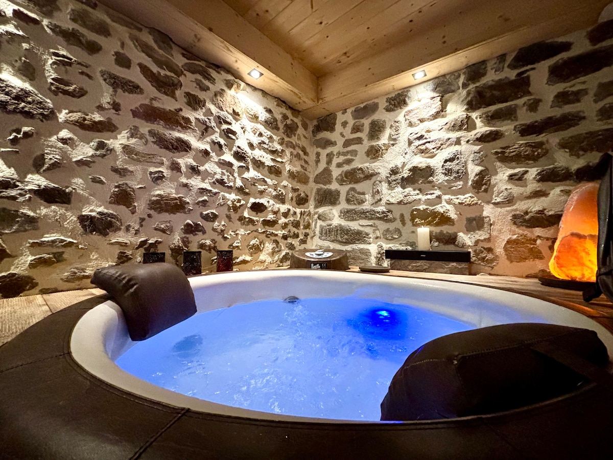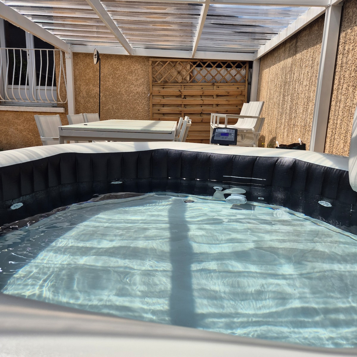 🌿 Un cocon de détente pour tous vos séjours 🌿 ℹ️ L’espace spa 🫧 est entièrement en intérieur, utilisable par tous les temps. La décoration (plafond végétalisé, plantes suspendues, herbe synthétique) recrée une ambiance extérieure tout en restant bien au chaud et à l’abri. 🏠 Logement attenant : chambre, salon, cuisine, salle de bain. Babyphone, linge, peignoirs, chaussons et ménage inclus. Logement non PMR