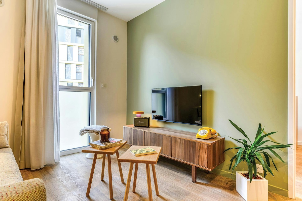 Your aparthotel Lyon Gerland is ideally located for exploring the various neighborhoods of Lyon. Situated right next to Metro Line B, you can reach Lyon Part-Dieu train station directly and within minutes. It's a 12-minute drive to Place Bellecour and 20 minutes to the new La Confluence district. You will find high-quality bedding, a living area with a sofa bed in the apartments, a workspace, and a kitchen equipped with electric cooktops, refrigerator, microwave, and kettle.