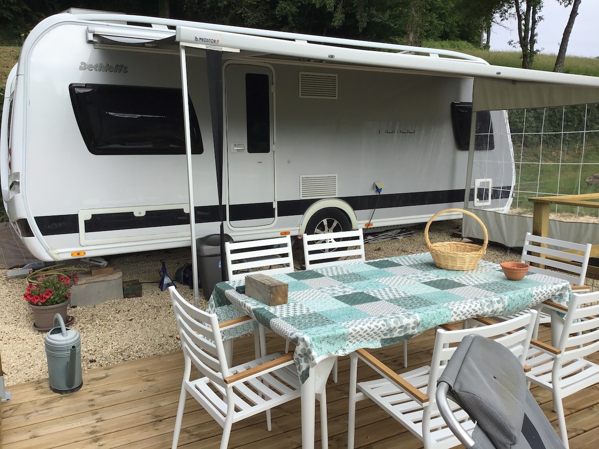 Deze zeer gerieflijke en gezellige caravan is gelegen in het uiterste zuiden van de Bourgogne . Met een prachtig zicht op de vallei en het mooie, nieuwe zwembad komt u hier helemaal tot rust. De caravan is uitgerust met verwarming , frigo/diepvriesvak alsook een volwaardig keukentje met kookbekken en oventje op gas . Een microgolfoventje is ook aanwezig. U hebt een toilet In de caravan die het liefst voor een plasje gebruikt wordt. Er is water en elektriciteit voorzien. Aparte privé badkamer.