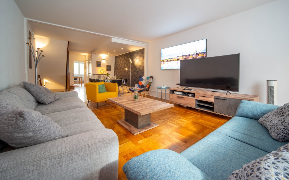 In the Monts d'Or, a natural area 15 min from Lyon, independent accommodation into the villa where we are living. Private terrace and access gym and sauna by reservation. Summer: swimming pool from 8am to 10am, and 2pm to 5:30pm. View of the Saône. Hiking trails, mountain bike rides. Restaurants, Demeure du Chaos Museum, Guinguettes on the banks of the Saône. Lyon Perrache railways 12min by train (railway station 15 min walk), Part-Dieu 35 min by bus.
