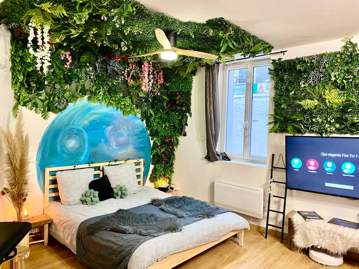 Plongez dans l’univers d’Avatar ✨. Studio immersif avec jungle suspendue, lumières tamisées et déco unique 🌿. Profitez du lit sous la canopée avec TV 55’’ 📺, d’une baignoire balnéo privative avec jets hydromassants 💦 et d’une table de massage pour un moment détente 💆. Séjour cocooning idéal pour un instant romantique ou relaxant, avec cuisine équipée et accès à pied aux commerces et restaurants du centre-ville 🍴.