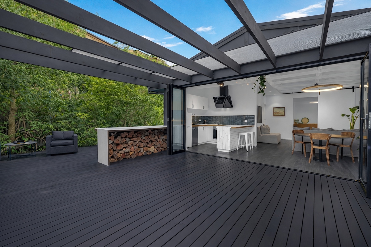 Light, bright and spacious. From the moment you walk in you'll feel calm and relaxed. Fire up the wood fire or simply press a button for instant warmth or cool. Comfy Koala mattresses on beds also equipped with electric blankets. Clean, white stone bench tops and a large cooktop and oven if eating-in is your plan. Stylish and comfortable living spaces. Streamlined bathroom and ensuite, each with a large glass-walled shower. Enjoy the grassy front deck area or sit around the fire pit at the back.