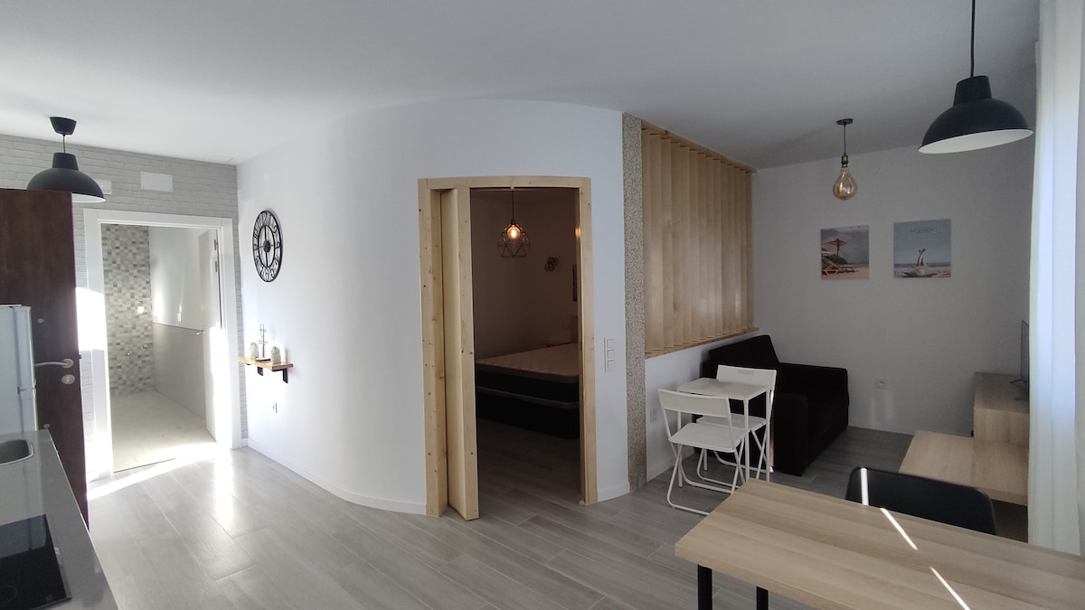 Moderno apartamento situado en el casco histórico de Marín, con vistas a la Escuela Naval Militar y Alameda Cuenta con 2 habitaciones, una doble y otra individual, careciendo de pared divisoria para conseguir mayor luminosidad, habiendo un baño que separa ambos ambientes para tener la suficiente intimidad Para cumplir con la normativa anti Covid, el acceso al apartamento se hace de manera autónoma sin necesidad de contacto entre el anfitrión y huésped (indicaciones en la guía del apartamento)