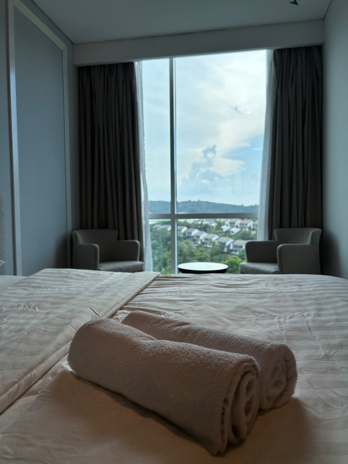 Apartment Nuvasa Bay, Kalani 1BR 12th, Sea & Golf View, Nongsa, Batam offers a relaxing stay with an outdoor pool, garden, and bar. Enjoy spacious room, free WiFi, sea views, and private parking. This beachfront apartment features 1 bedroom, a living area, a fully equipped kitchen, and a bathroom with a shower. Towels and bed linen are provided. A private beach area is available, Nongsa Beach is an 8 mins walk, and Bale Bale Beach is 2.9 km away. Hang Nadim Airport is 10 km from the apartment.