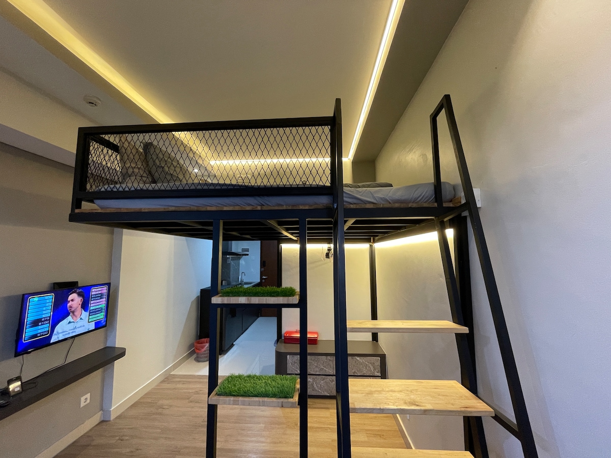 Welcome to our unique Mezzanine double storey Studio Unit, with custom furnishings and a spacious living room; providing a peaceful haven for rest and relaxation. This apartment unit is the perfect place to call home, and we can't wait to show it to you. ROOM AMENITIES: Wifi TV AC Fridge Hot Shower Soap&Shower Gel Towels Laundry (request) Cleaning (request)